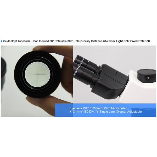 Head : Seidentopf Head, Inclined 30°, Rotatable 360°, Interpupillary Distance 48-75mm, Left Eyepiece Tube Diopter Adjustable +/-5°, Trinocular Head Light Split 20:80.